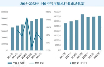 我国空气压缩机行业经过多年的发展,目前已处于比较成熟的阶段,品牌型号多样,国内同类型产品与国际知名品牌在生产能力、制造水平、产品质量、可靠性上已经日趋接近,并且与国际品牌相比具有较高的性价比优势,市场实现充分竞争。国内石化、机械、钢铁、电力和冶金等空气压缩机主要下游行业的快速发展,拉动了国内市场对空气压缩机的需求。此外,随着全球压缩机产业向中国的转移,受出口市场需求的推动,中国国内空气压缩机的产量也随之高速增长。据统计,截至2022年我国空气压缩机产量约为50096.2万台,需求量约为35947.8万台。
