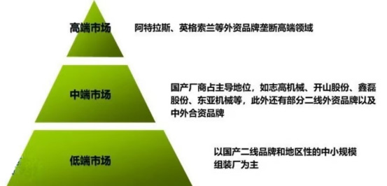 我国螺杆机行业整体处于成熟发展阶段,参与厂商较多。行业竞争格局成典型的金字塔型,中低端厂商众多。高端市场行业集中度较高,具备技术先发优势的大型外资企业引领市场发展并占据了主要市场份额。随着制造工艺、技术的进步,国内优秀螺杆机企业在中高端市场不断推出具有竞争力的产品,整体份额正不断提升。